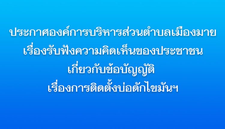 ประกาศองค์การบริหารส่วนตำบลเมืองมาย เรื่องรับฟังความคิดเห็นของประชาชนเกี่ยวกับข้อบัญญัติ เรื่องการติดตั้งบ่อดักไขมันฯ Loading... Taking too long? Reload document | Open in new tab Download Share FacebookTwitterGoogle+ReddItWhatsAppPinterestอีเมล์