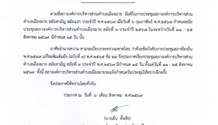 เรียกประชุมสภาองค์การบริหารส่วนตำบลเมืองมาย สมัยสามัญ สมัยที่ ๓ ประจำปี พ.ศ.2567 Loading... Taking too long? Reload document | Open in new tab Share FacebookTwitterGoogle+ReddItWhatsAppPinterestอีเมล์