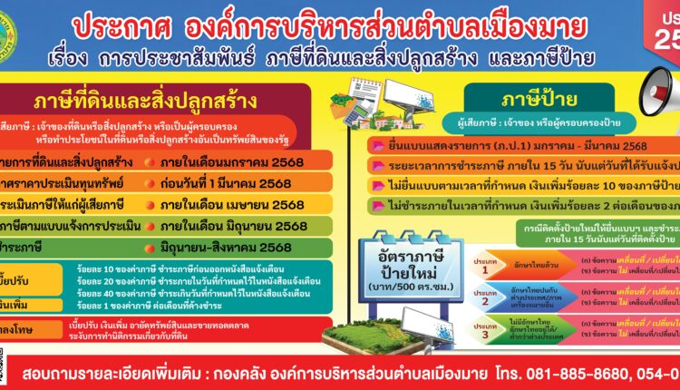 📢📢ประกาศองค์การบริหารส่วนตำบลเมืองมาย📢📢 📌📌เรื่อง การประชาสัมพันธ์ ภาษีที่ดินและสิ่งปลูกสร้าง และภาษีป้าย ประจำปี พ.ศ. 2568 Share FacebookTwitterGoogle+ReddItWhatsAppPinterestอีเมล์