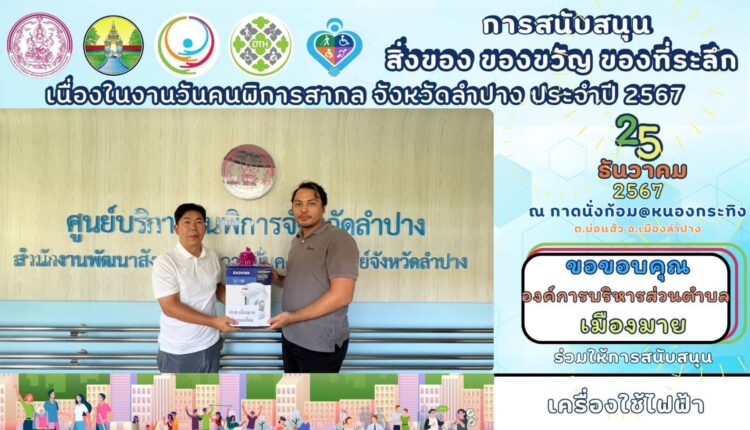 วันที่ 20 ธันวาคม 2567 นายติ๊บ บุญยืน นายกองค์การบริหารส่วนตำบลเมืองมาย มอบหมาย นายนราดรน์ วงค์สวัสดิ์ นักพัฒนาชุมชน มอบของขวัญ ของที่ระลึก ให้กับ ศูนย์บริการคนพิการจังหวัดลำปาง เพื่อนำไปมอบให้กับผู้พิการ ในวันคนพิการสากล จังหวัดลำปาง ใน วันที่ 25 ธันวาคม 2567