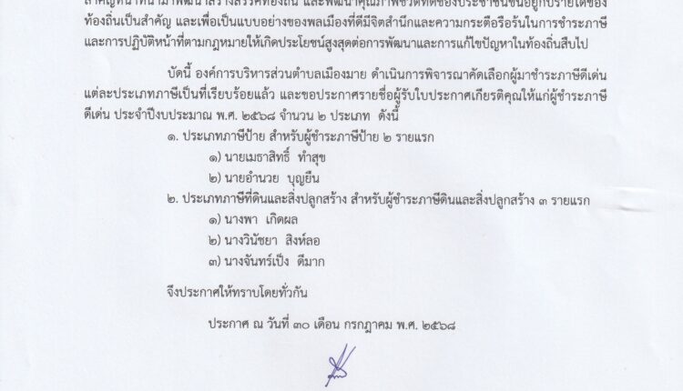 ประกาศองค์การบริหารส่วนตำบลเมืองมาย เรื่อง การมอบใบประกาศเกียรติคุณแก่ผู้ชำระภาษีดีเด่น ประจำปีงบประมาณ พ.ศ. 2568 Share FacebookTwitterGoogle+ReddItWhatsAppPinterestอีเมล์