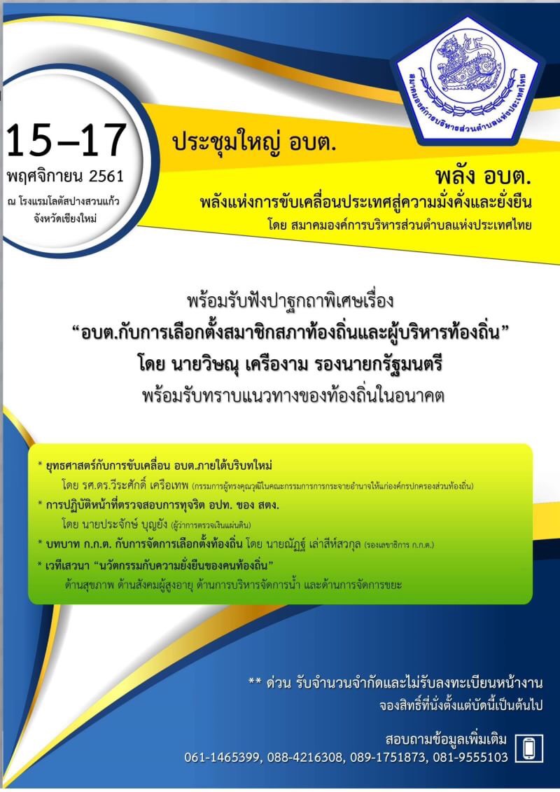 กิจกรรมประชุมใหญ่องค์การบริหารส่วนตำบล องค์การบริหารส่วนตำบลเมืองมาย ร่วมประชุมในกิจกรรมประชุมใหญ่องค์การบริหารส่วนตำบล และรับทราบแนวทางของท้องถิ่นในอนาคต เมื่อวันที่ 15 – 17 พฤศจิกายน 2560 ณ โรงแรมโลตัสปางสวนแก้ว จ.เชียงใหม่ Share FacebookTwitterGoogle+ReddItWhatsAppPinterestอีเมล์