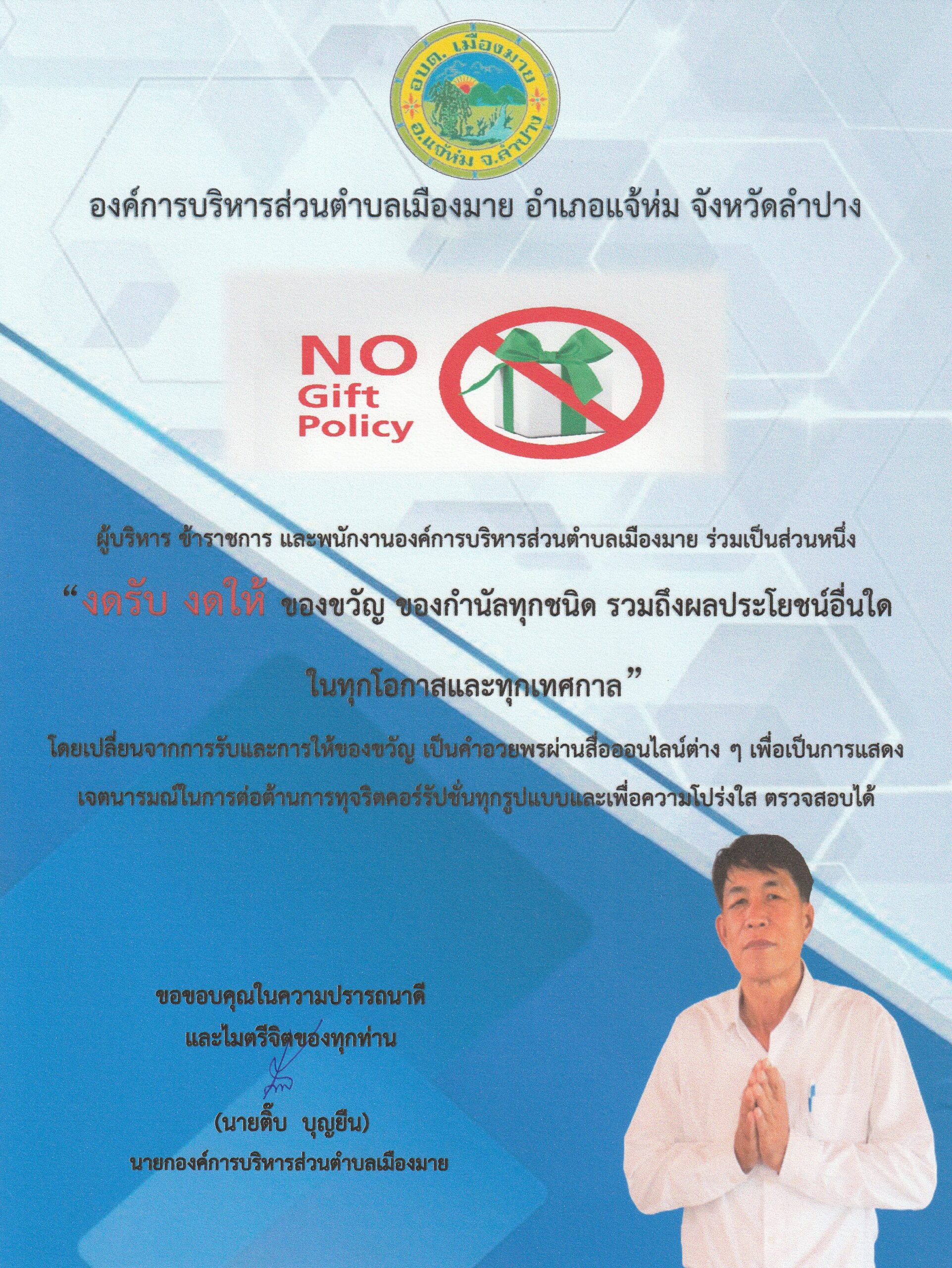 องค์การบริหารส่วนตำบลเมืองมาย นำโดย นายติ๊บ บุญยืน นายกองค์การบริหารส่วนตำบลเมืองมาย คณะผู้บริหาร ข้าราชการ และพนักงานองค์การบริหารส่วนตำบลเมืองมาย ร่วมเป็นส่วนหนึ่งในการสนับสนุนนโยบาย #No #Gift #Policy “#งดรับ #งดให้ ของขวัญ ของกำนัลทุกชนิด รวมถึงผลประโยชน์อื่นใดในทุกโอกาสและทุกเทศกาล ”