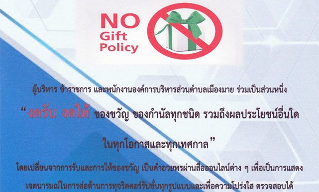องค์การบริหารส่วนตำบลเมืองมาย นำโดย นายติ๊บ บุญยืน นายกองค์การบริหารส่วนตำบลเมืองมาย คณะผู้บริหาร ข้าราชการ และพนักงานองค์การบริหารส่วนตำบลเมืองมาย ร่วมเป็นส่วนหนึ่งในการสนับสนุนนโยบาย #No #Gift #Policy “#งดรับ #งดให้ ของขวัญ ของกำนัลทุกชนิด รวมถึงผลประโยชน์อื่นใดในทุกโอกาสและทุกเทศกาล ”